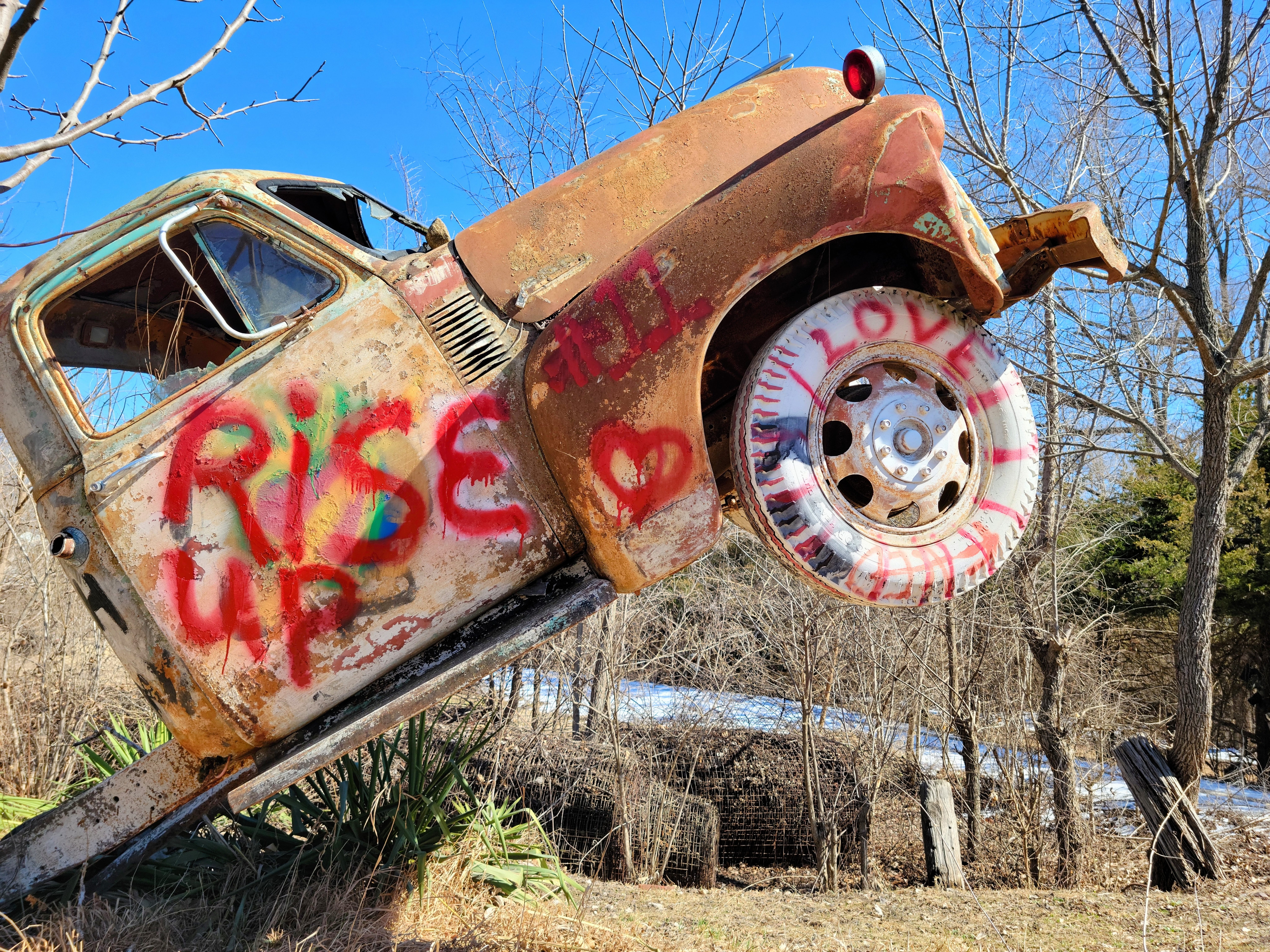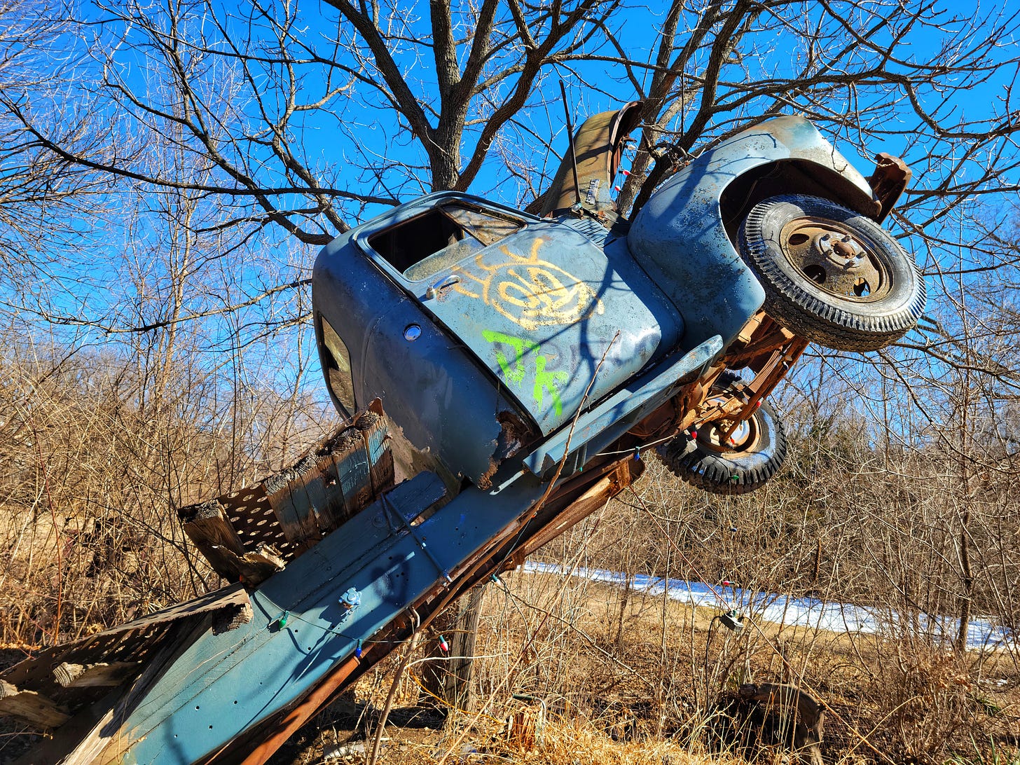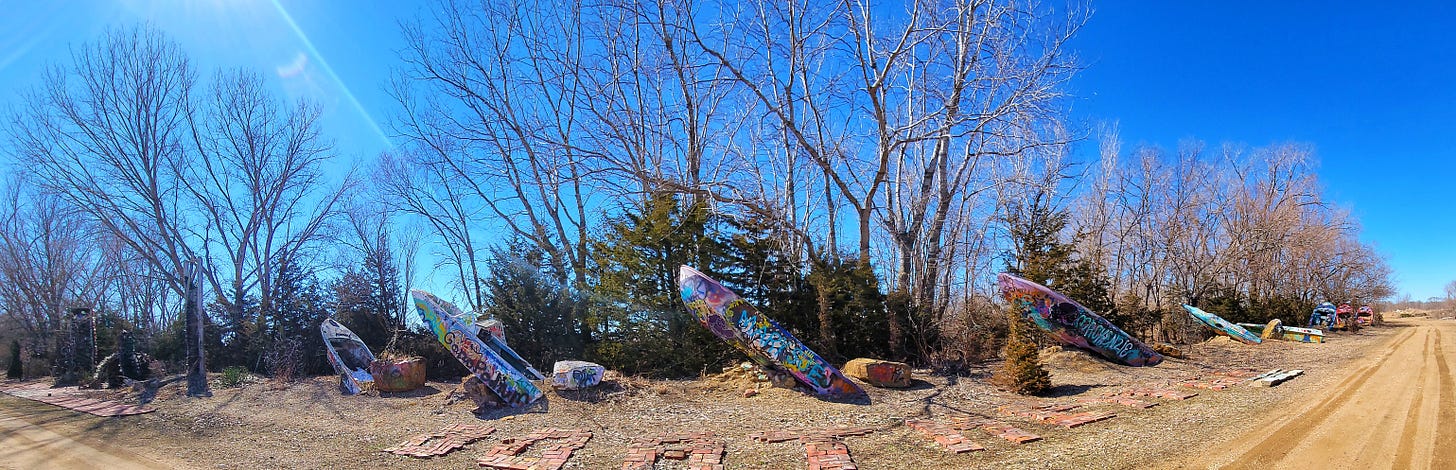 Outside of Topeka, KS sits the sprawling acres of Truckhenge. Built by the cantankerous Ron Lessman who was told by the county to get rid of all the trucks on his property as there were too many. The county claimed, if a flood came, all his vehicles would float away and pollute the nearby rivers and lakes. Ron had the last laugh though; he poured 42,000 pounds of concrete on his property and planted all his trucks (and buses and boats too) so they stood upright out of the ground and could never float away. When explaining this to me, Ron demonstrated what he’s done with his trucks. Slapping his left hand into the inside crease of his right elbow, his right arm jerked up and he made a fist in defiance.