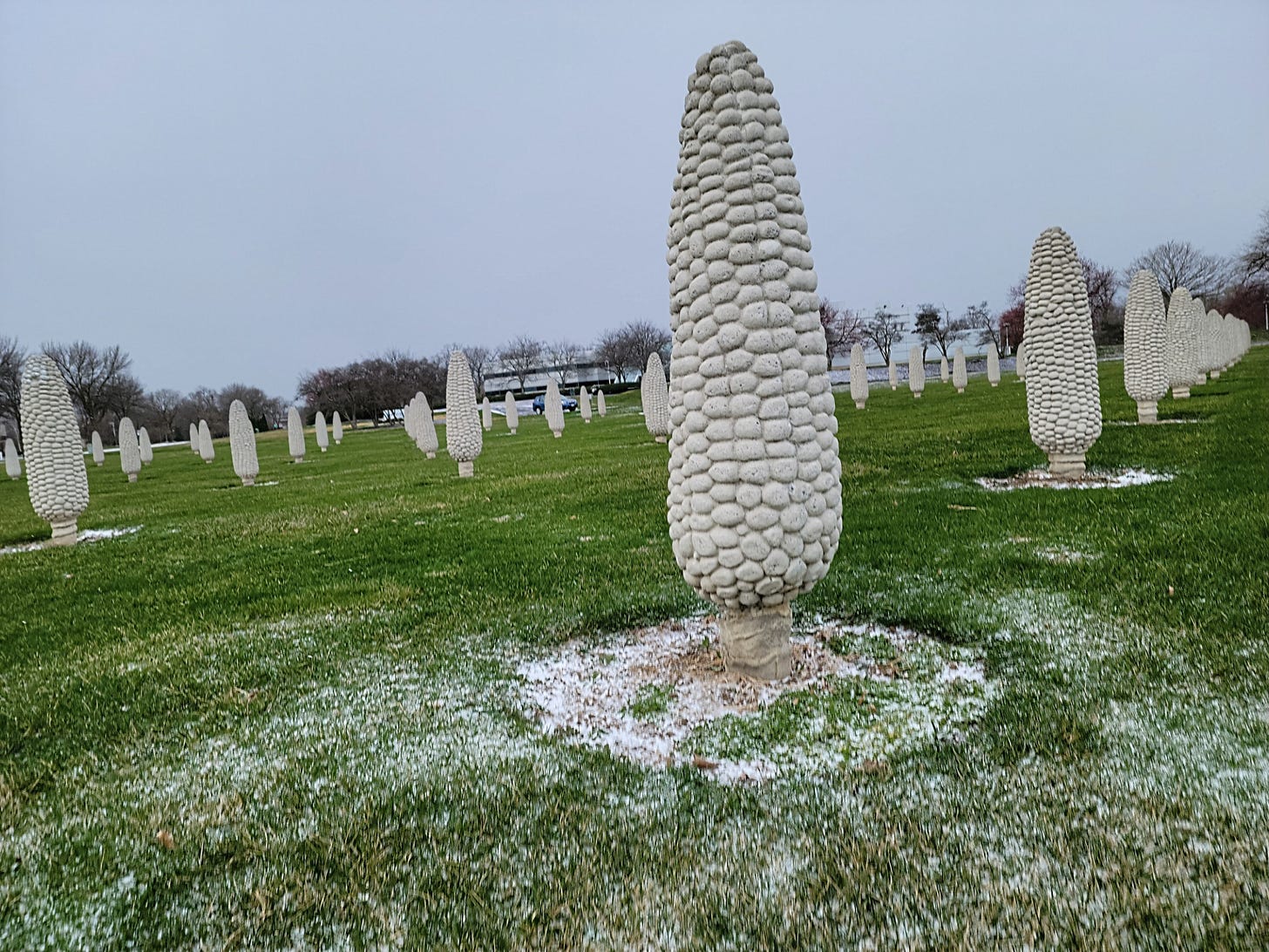 In Dublin, OH they have taken a twist on the “Field of Dreams” to make their “Field of Corn.” This cornhenge is made up of over 100 human-sized concrete white ears of corn, an art piece honoring the crop that had been raised here since the 1800s. It also pays tribute to a leading hybrid corn farmer who began revolutionizing the way corn was raised back in the 1940s. The art piece seems especially eerily poignant now that Monsanto’s genetically modified crops represent 90 percent of the corn grown in the US. Standing in this concrete field of white statues, the art installation takes on a dystopian tone in this age of Monsanto, like you’re in the middle of some cemetery dedicated to the obsolete family farmer.