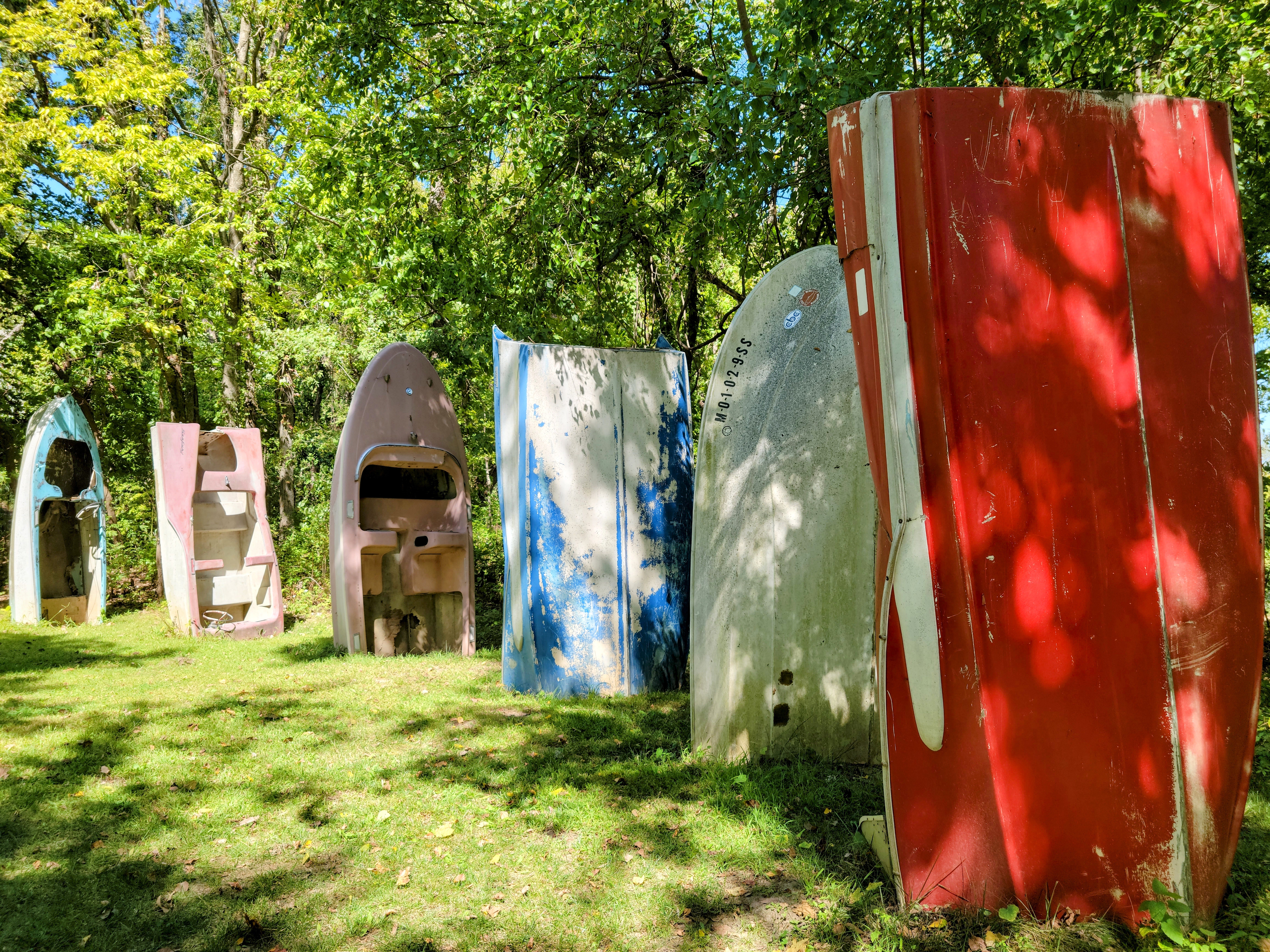 Just outside of Columbia, MO, near the Katy Trail and next to the Missouri River is an unexplained art piece called BoatHenge. It’s situated in a clearing off the trail, where a mysterious artist decided to plant boats versus trees. There is speculation on its origins—either it just fell from heaven, arrived on the first day of spring or was erected to commemorate the recent great floods. Whatever the meaning of this semi-circle of boats, it doesn’t seem to be an accident their measurements are almost the same as the rocks in England.